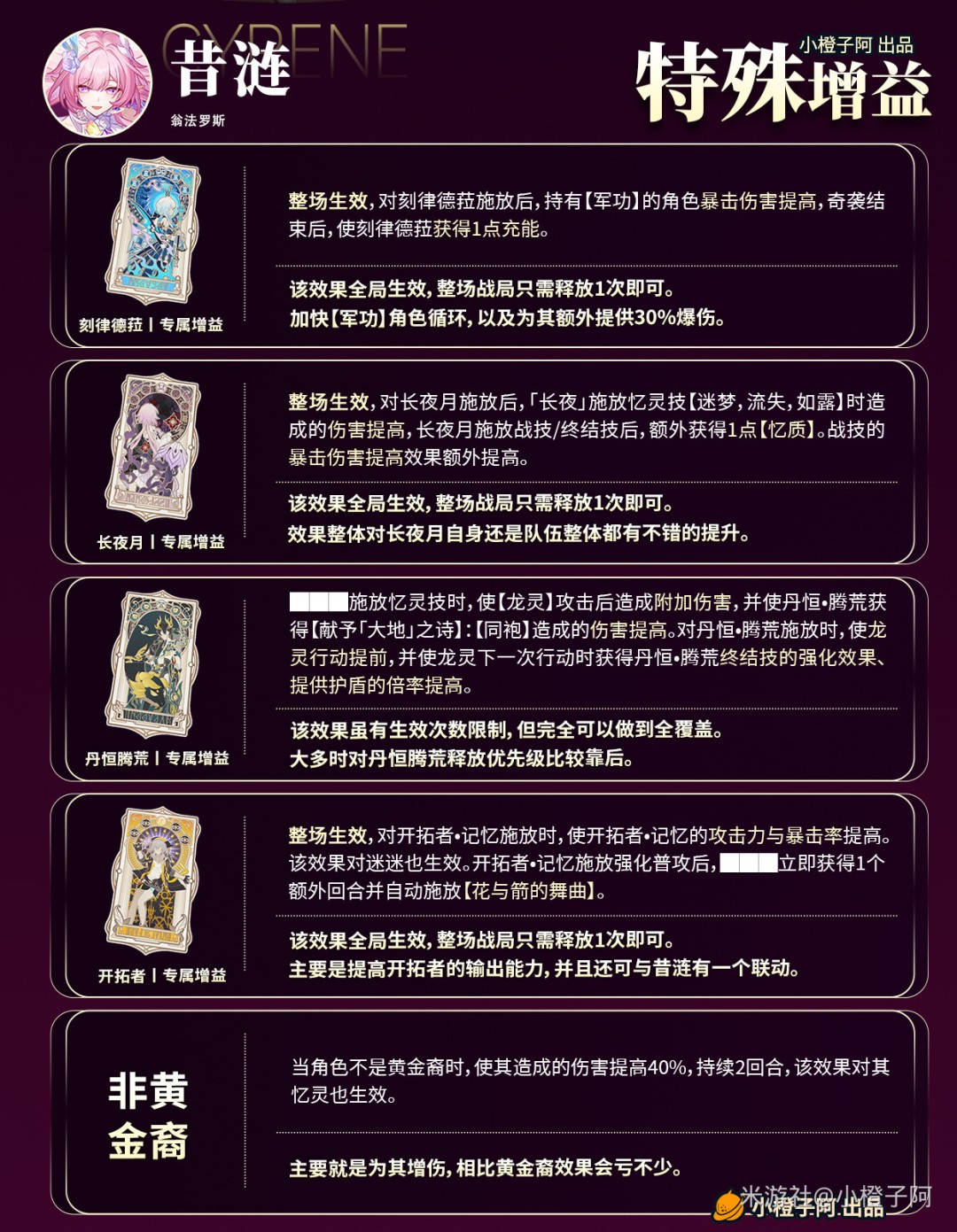 主要就是生命值加成,提升昔涟的输出能力,但是堆速度的压力会比较大,搭配【救世主】+【翁法罗斯】需要17个速度副词条达到180+的速度。
