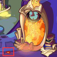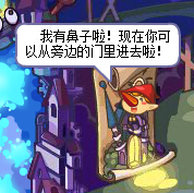 在幽暗空间入口的中间,有一道火红色的传送门,用星星魔法打一下门框内的火焰,传送门上方的红色的小鼻子掉下来,捡起这个小鼻子来,按住鼠标左键不放,拖拽到小人偶的身上,给他装回去,把鼻子还给人偶后,幽暗空间一层的入口就开启了。