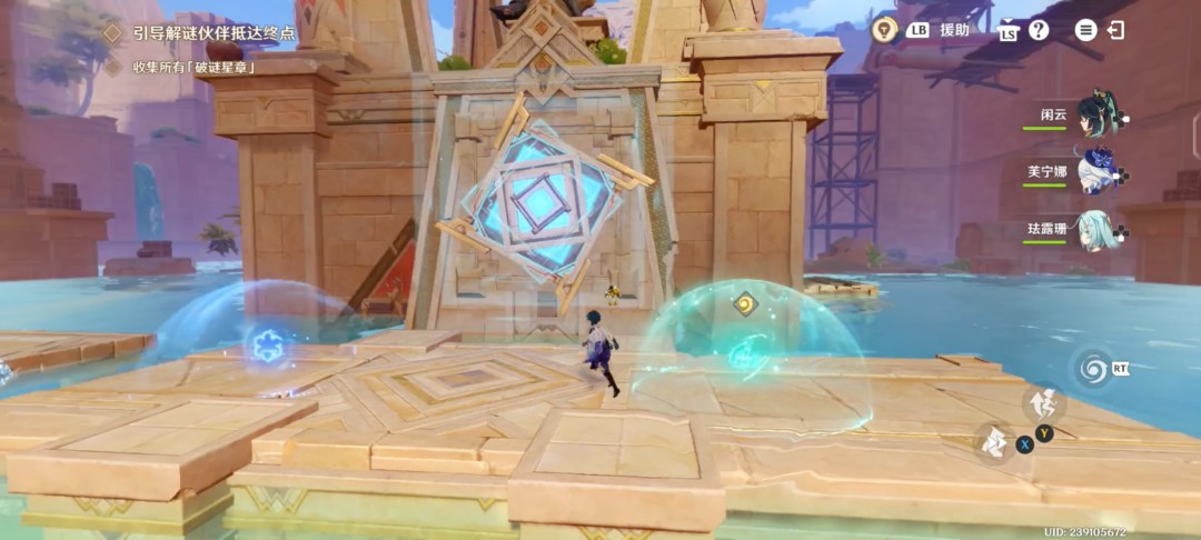 最后拾取左手边平台上的[升腾奇效],并放置在面前的基座上,等待解密伙伴到达终点后过关。
