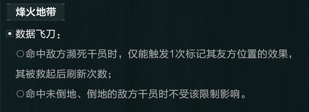1、命中敌方濒死干员时,仅能触发1次标记其友方位置的效果其被救起后刷新次数。
