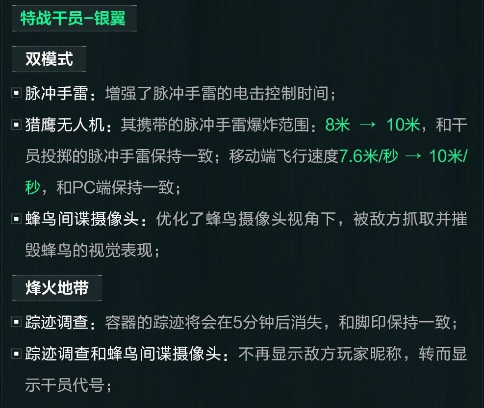 2、猎鹰无人机:其携带的脉冲手雷爆炸范围:8米一10米,和干员投掷的脉冲手雷保持一致;动端飞行速度7.6米/秒一10米/秒,和PC端保持一致。