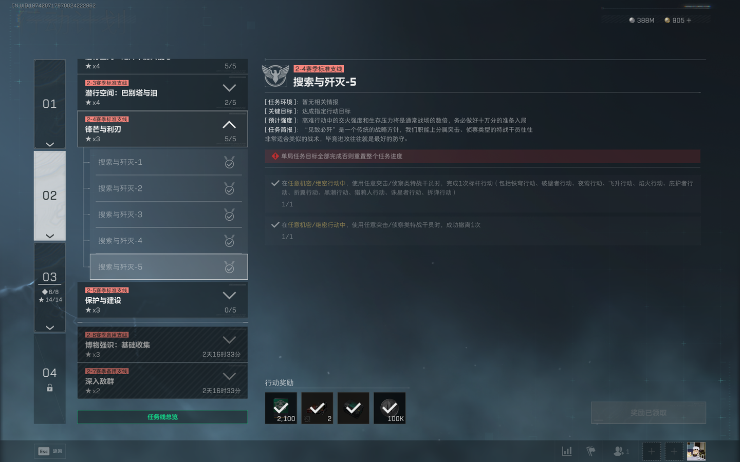 2、在任意机密/绝密行动中,使用任意突击/侦察类特战干员时,成功撤离1次