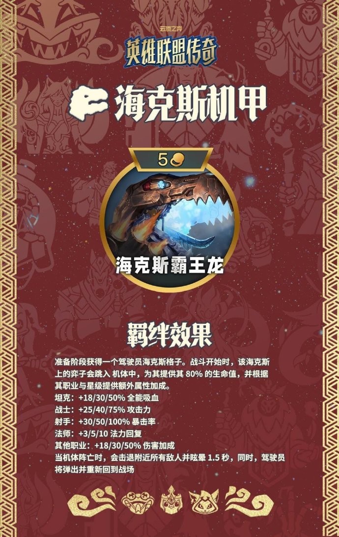 准备阶段获得一个驾驶员海克斯格子。战斗开始时,该海克斯上的弈子会跳入机体中,为其提供其80%的生命值,并根据其职业与星级提供额外属性加成。