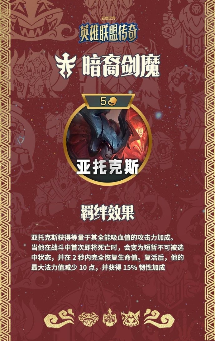 亚托克斯获得等量于其全能吸血值的攻击力加成。当他在战斗中首次即将死亡时,会变为短暂不可被选中状态,并在2秒内完全恢复生命值。复活后,他的最大法力值减少10点,并获得15%韧性加成