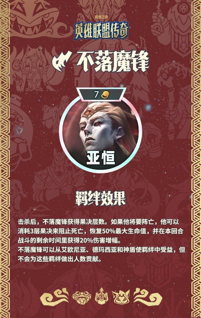 击杀后,不落魔锋获得果决层数。如果他将要阵亡,他可以消耗3层果决来阻止死亡,恢复50%最大生命值,并在本回合战斗的剩余时间里获得20%伤害增幅。