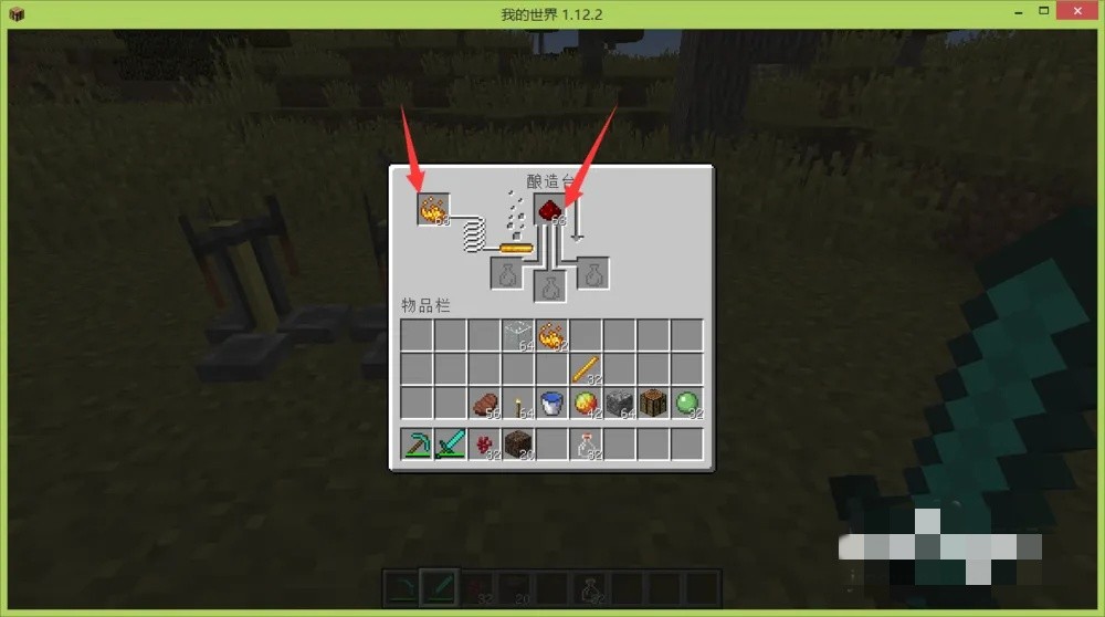 然后我们至少准备3个酿造台,每个酿造台中左边放上烈焰粉,顶部放合成药品材料,第一个酿造台放地狱疣,第二个放岩浆膏,第三个放红石。