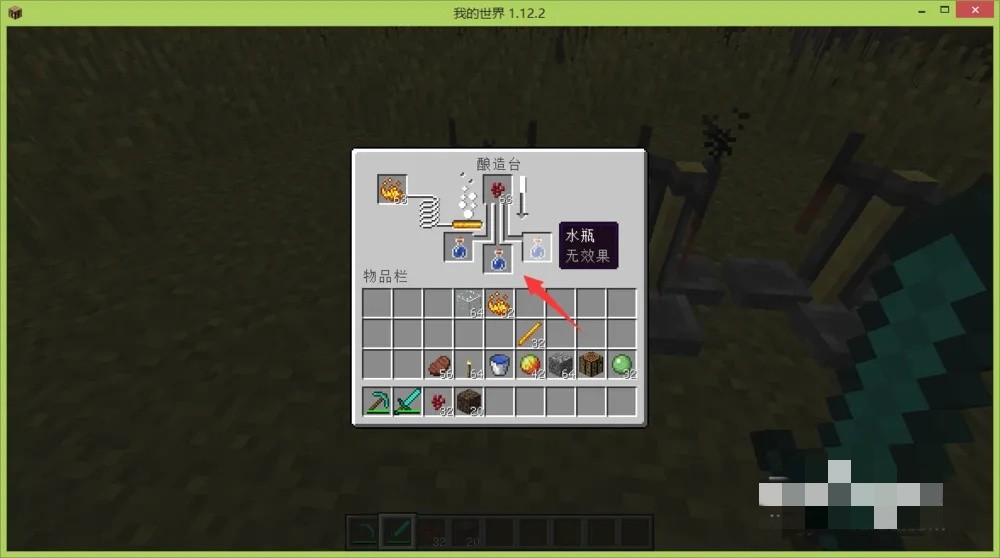 然后我们第一个酿造台放水瓶,空瓶子舀水变成水瓶;第二个放的是第一个酿造台造好的“粗制的药水”;第三个放第二个酿造台造好的有3分钟效果的抗火药水;加上红石是为了将抗火的时间从3分钟加到8分钟。