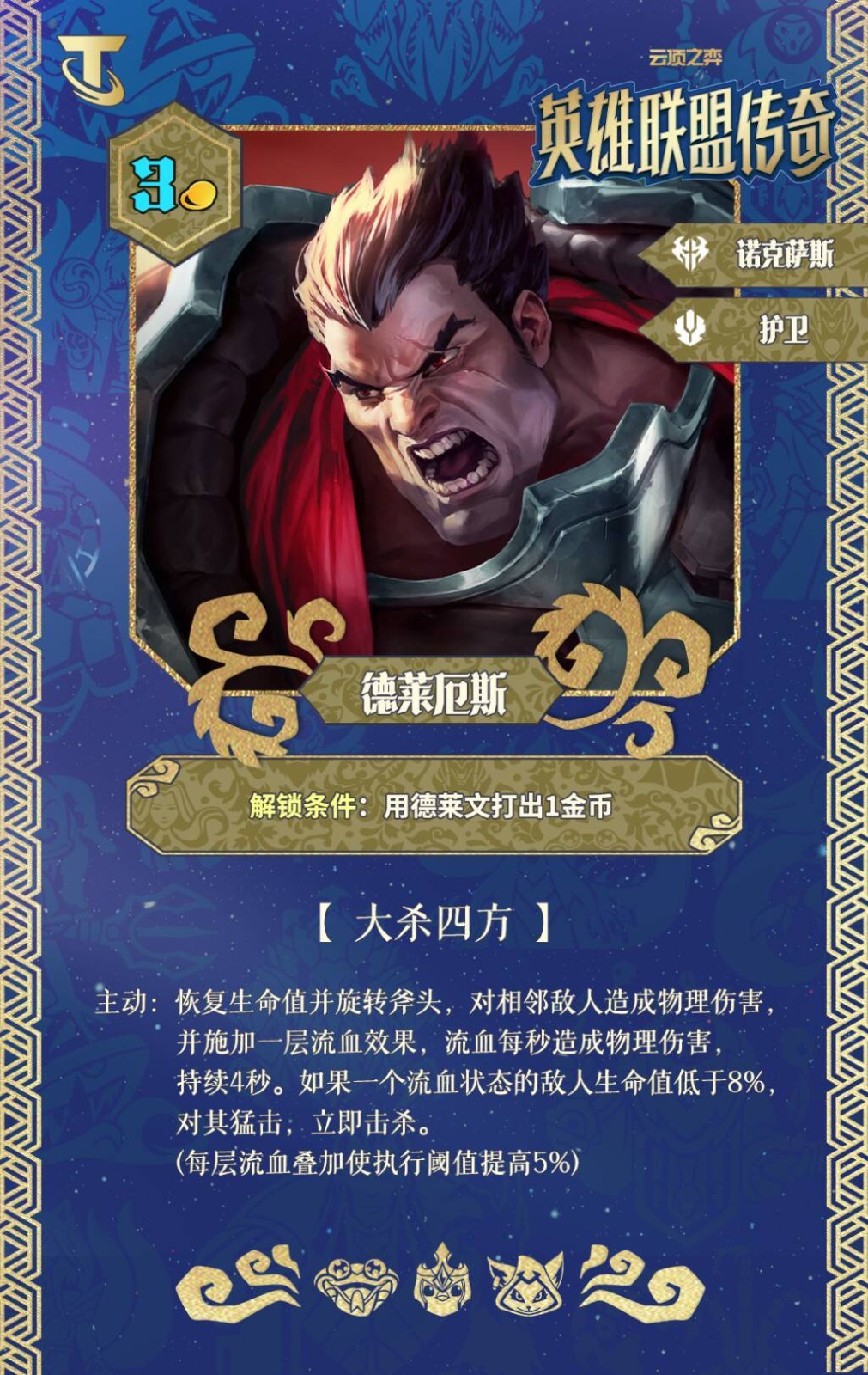 云顶之弈S16版本英雄联盟传奇主题PBE美测服更新了,在新赛季会增加很多新的羁绊和棋子,还有不少老羁绊,老英雄的回归,那么有不少小伙伴好奇各个英雄的技能是什么,下面就给大家带来s16德莱厄斯羁绊效果一览。
