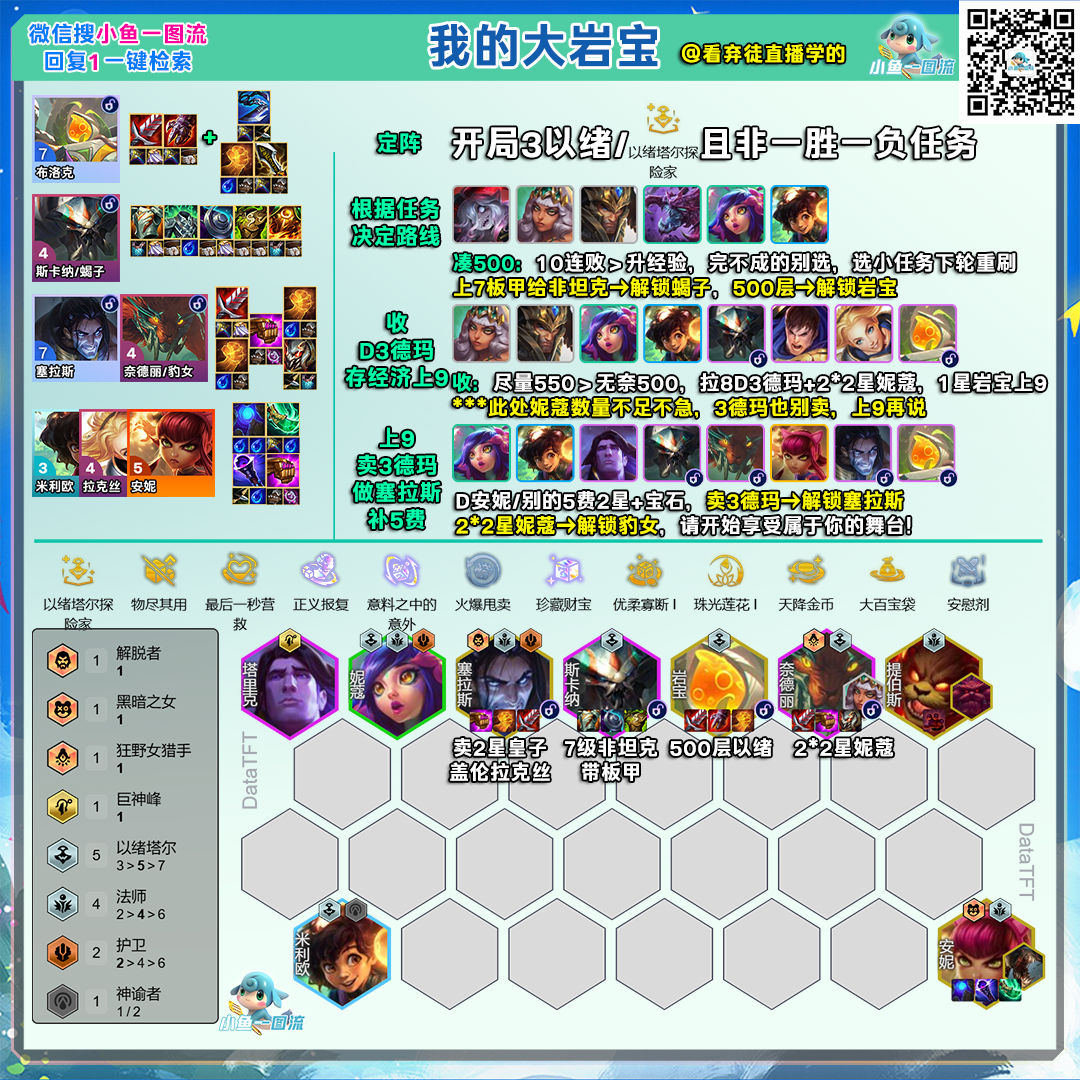 不着急做:①卖2星皇子盖伦拉克丝,8级过渡用,9级再卖→解锁塞拉斯②2组2星妮蔻,550有50%出7小2大妮蔻可以捏,或者8~9级随缘D→解锁豹女,没来就奇亚娜用着