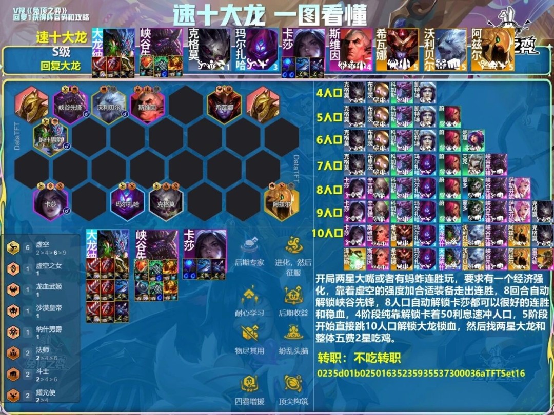 开局两星大嘴或者有蚂蚱连胜玩,要求有一个经济强化,靠着虚空的强度加合适装备走出连胜,8回合自动解锁峡谷先锋,8人口自动解锁卡莎都可以很好的连胜和稳血,4阶段纯靠解锁卡着50利息速冲人口,5阶段开始直接跳10人口解锁大龙锁血,然后找两星大龙和整体五费2星吃鸡。