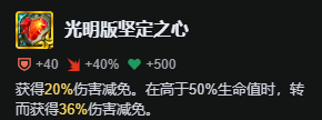 【光明版坚定之心】:简称光明心之钢,这件装备光明版非常离谱,按理来说一个前排坦克给上双心之钢,由于两件心之钢减伤来源不一样,所以计算结果是乘法计算,也就是说正常两件心之钢减伤应该是32%左右,但光心之钢单一件就能高达36%,堪称S16最强坦克光装