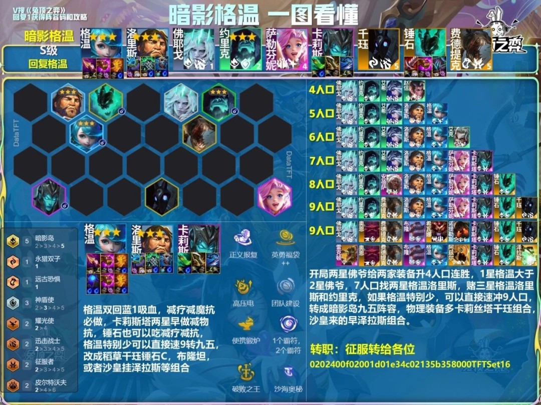 云顶之弈S16版本英雄联盟传奇主题,在新赛季会增加很多新的羁绊和棋子,还有不少老羁绊,老英雄的回归,那么有不少小伙伴好奇新赛季有什么强力阵容,下面就给大家带来s16暗影格温阵容推荐。