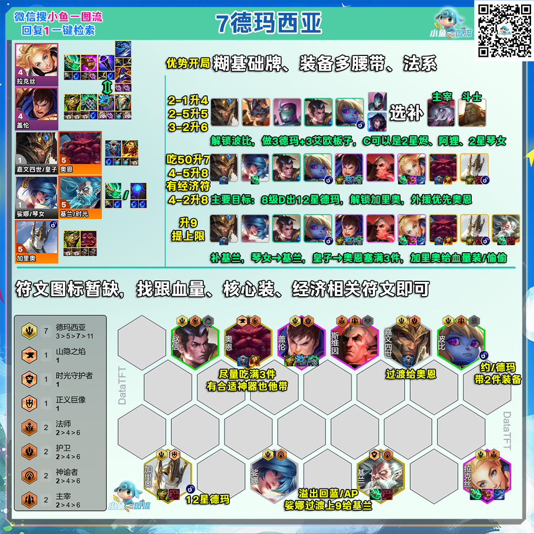 整局核心:拿1经济在8级搜出12星德玛西亚解锁加里奥,站住脚上9(关键发力期,8级9人口打别人8人口,如果上不去9,也能在天崩局迫降8级硬搜2星加里奥吃分)