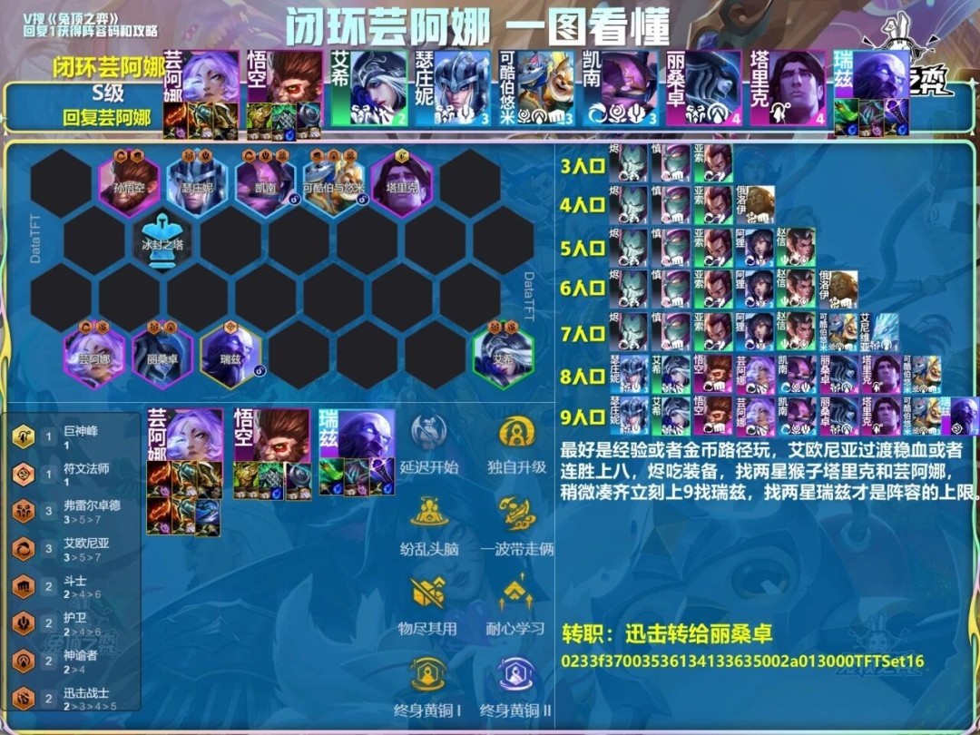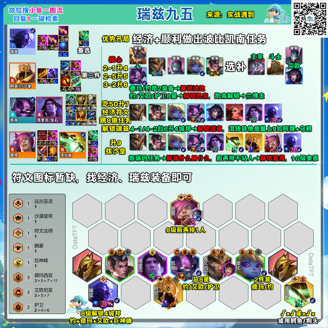 4阶段:只要顺利凯南解锁了,再拿个经济跳8,你的过渡+任意巨神峰就是解锁瑞兹公式,但1星瑞兹锁不住,必须要搭点别的质量上9找沙皇做任务