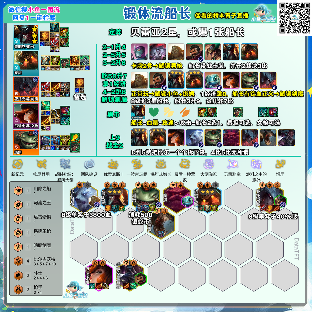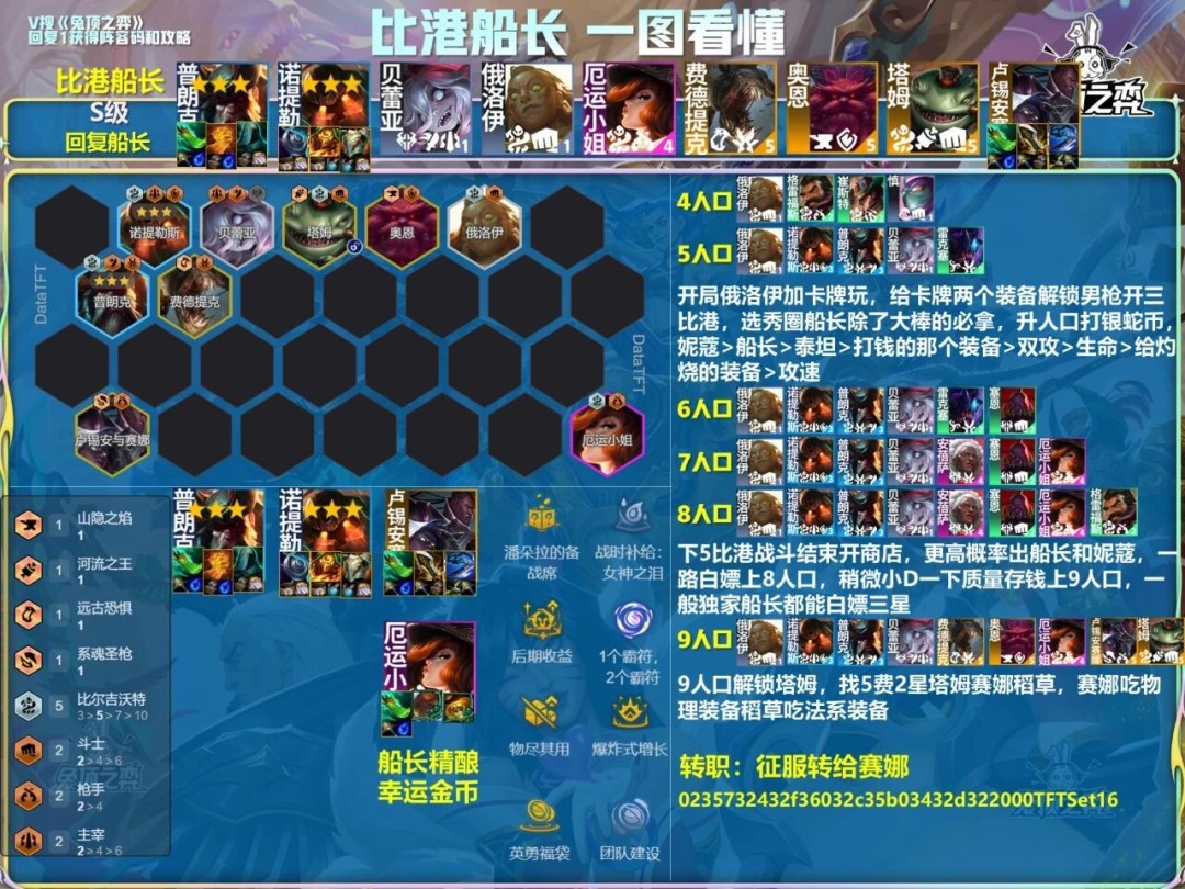 开局3比港,拿比港船长和妮蔻快速三星船长,没三星也能换卑尔维斯,优先做剑魔装备,双吸血解锁剑魔加羊刀泰坦锁血8阶段如果比港很晚就不养船长优先养卑尔维斯,靠剑魔或者船长的强度速度上9人口
