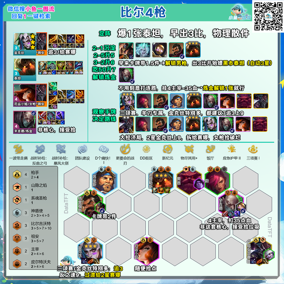 重点任务:①卡牌带1.5件→解锁男枪②可连败可正常玩,挂4主宰-35血→解锁炼金(非这套核心,但是挂重伤好手)