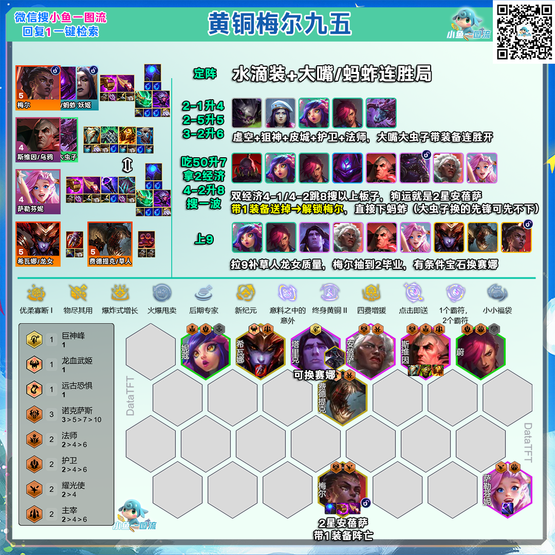 符文控制:梅尔那个235的光明装,你上9再解锁是永远吃不出来的,而且乌鸦妮蔻蔚芬妮蚂蚱这几张巨热门,这几个里面没几个2就是流着血上9,所以干脆1.5-2经济4-1或4-2拉8抢D质量,狗运出2星安蓓萨送掉解锁梅尔,直接让蚂蚱滚,打外面跟打儿子一样,决赛圈能吃个光明装出来,变形弥补前两个经济符文的亏损