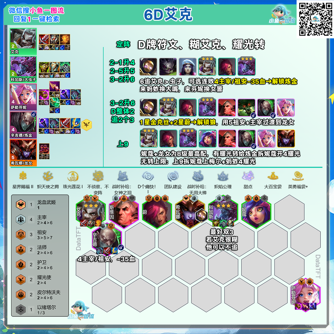 注意:剑魔阵容有很多,诺克、比尔、4主宰4裁决、带2皮城、带3诺克,本期的2皮是相对平滑且后期上限足够的一种95