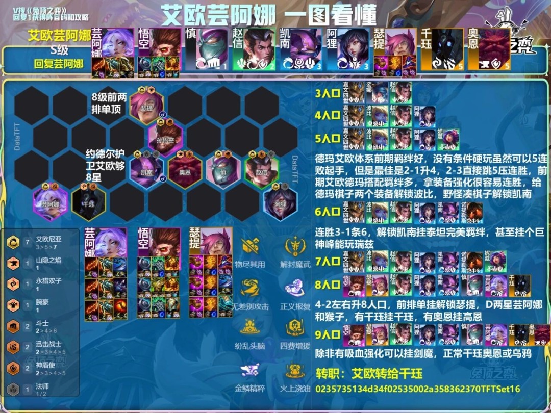 4-2左右升8人口,前排单挂解锁瑟提,D两星芸阿娜和猴子,有干珏挂干珏,有奥恩挂高恩。