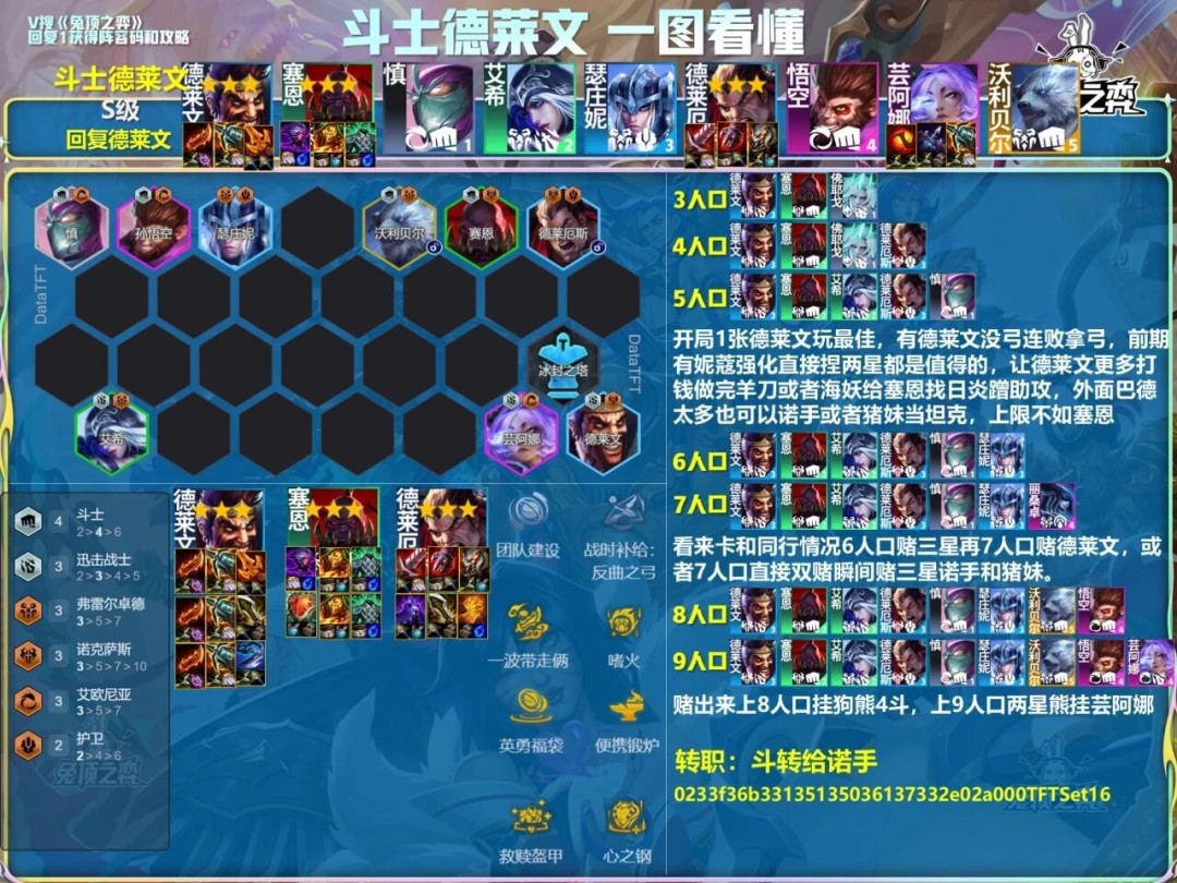 德玛艾欧体系前期羁绊好,没有条件硬玩虽然可以5连败起手,但是最佳是2-1升4,2-3直接跳5压连胜,前期艾欧德玛搭配羁绊多,拿装备强化很容易连胜,给德玛棋子两个装备解锁波比,野怪凑棋子解锁凯南。