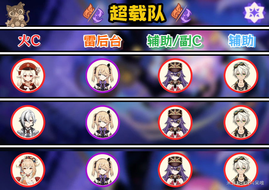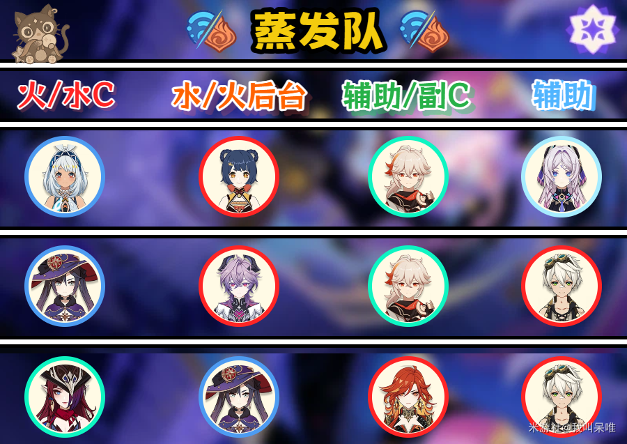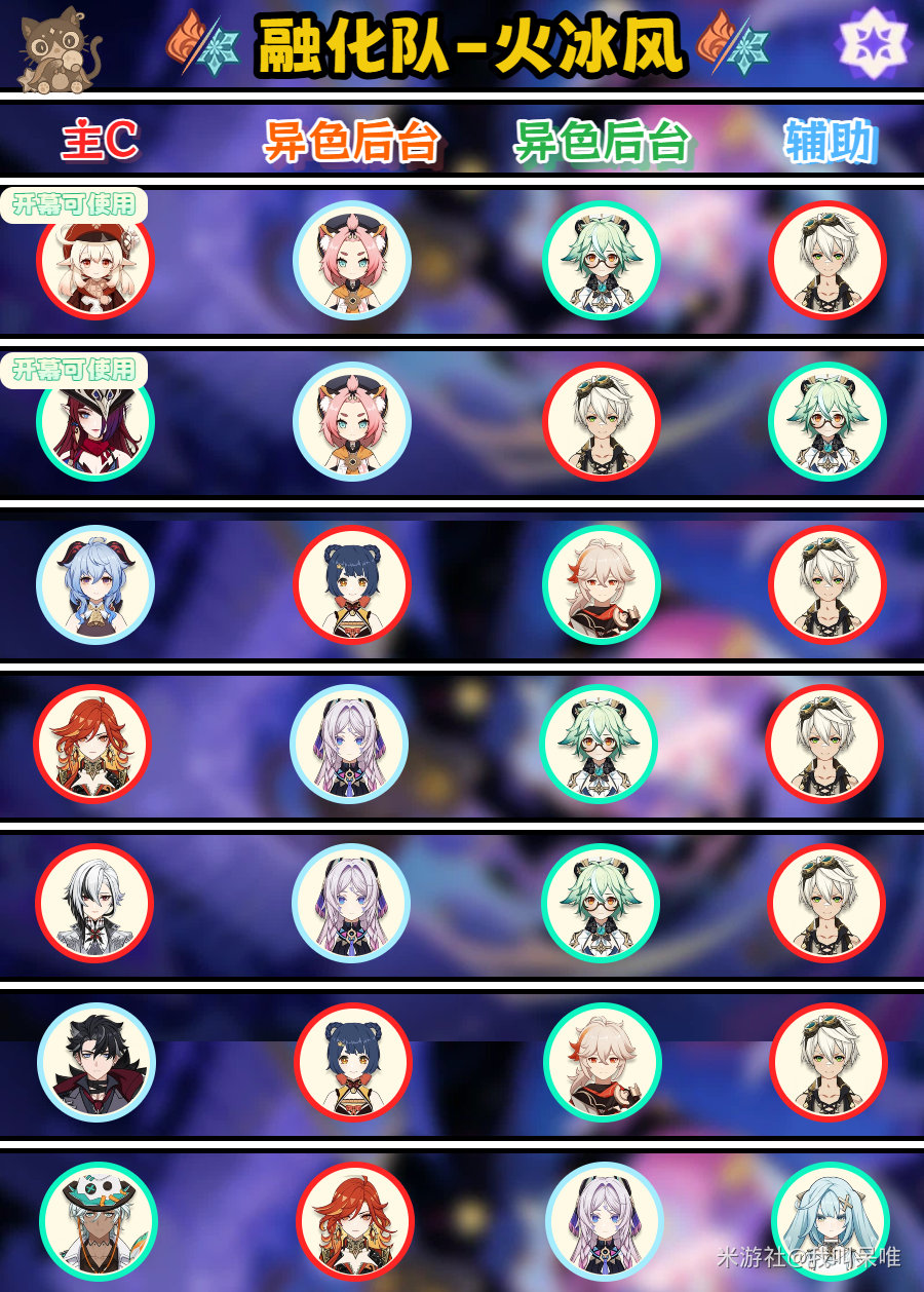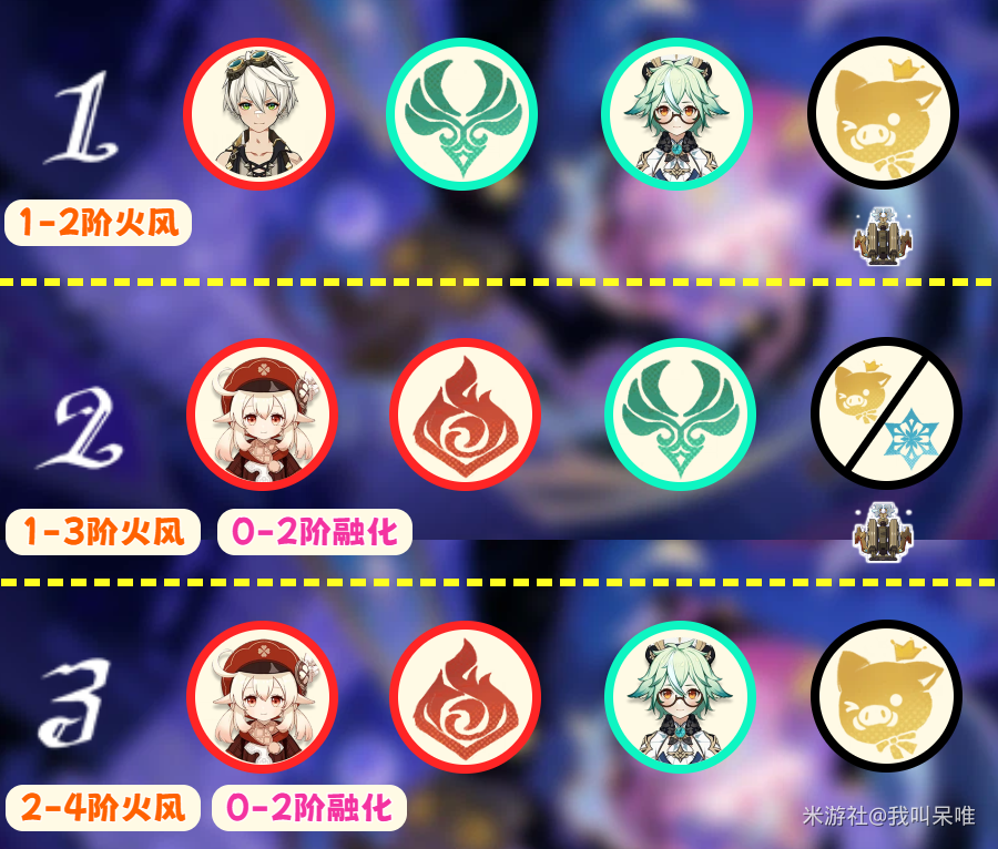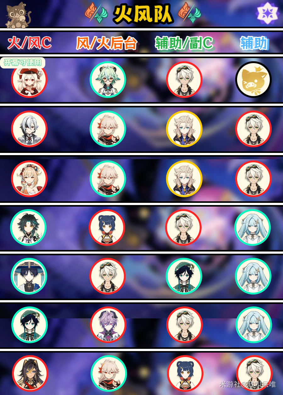 火元素与风元素角色组合,主要利用火风的触发简单、给的多,以及火C的较高强度来组队。