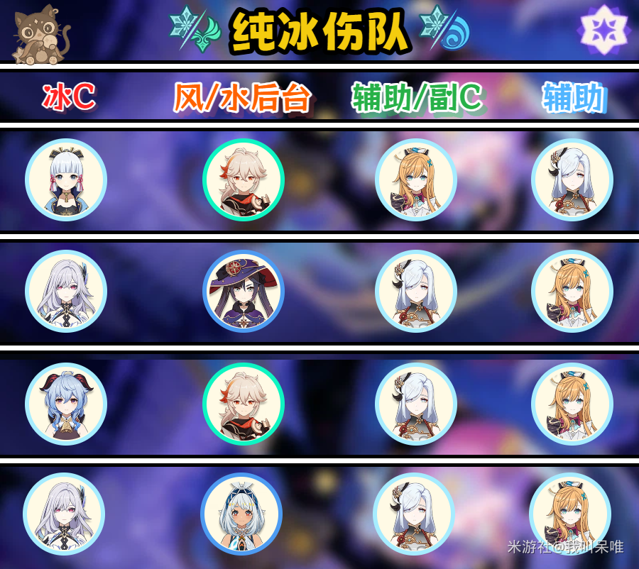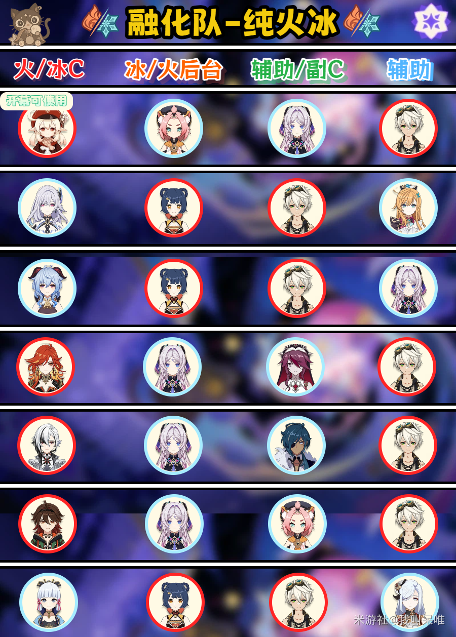 能减抗能增伤,本期能当火/冰/水C的通用拐,哪里缺输出就去哪里,但更多还是利用稳定挂冰搭配火C打融化。