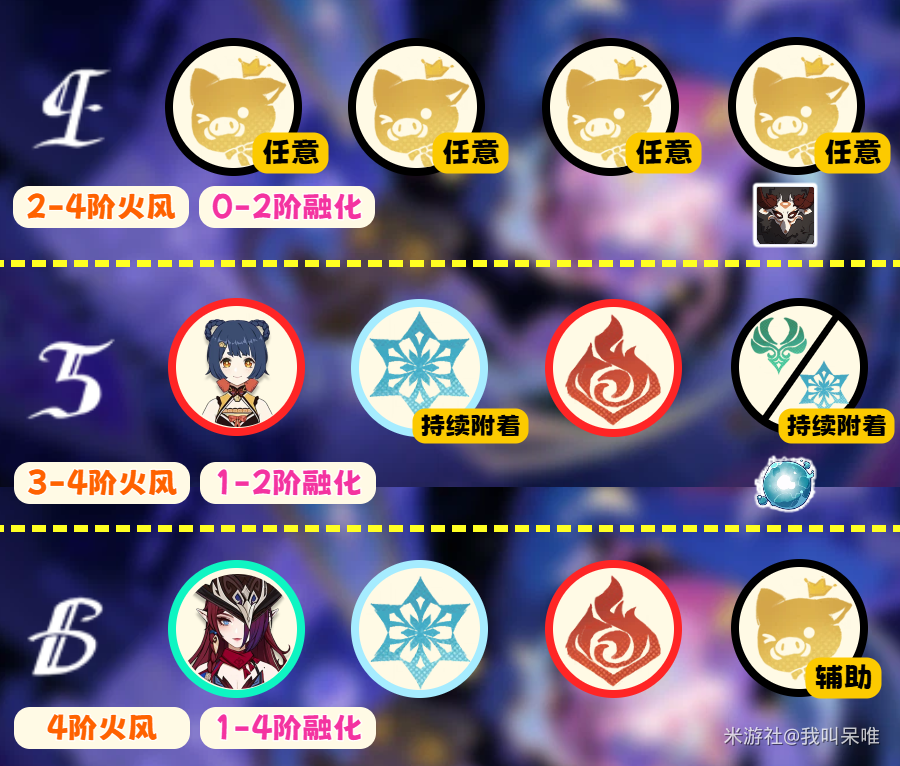 火/冰/风元素主C输出,搭配对应异色后台元素可稳定同时触发三种祝福。