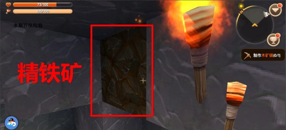 多做火把耐心挖掘。出现野人就用石矛攻击。挖到足够的铁矿后沿着火把方向原路返回。
