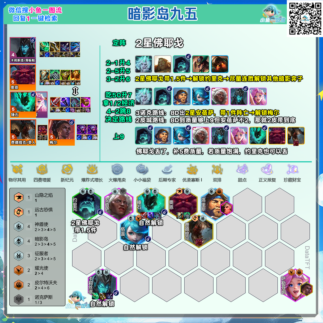 云顶之弈S16版本英雄联盟传奇主题,在新赛季会增加很多新的羁绊和棋子,还有不少老羁绊,老英雄的回归,那么有不少小伙伴好奇新赛季有什么强力阵容,下面就给大家带来s16暗影岛九五阵容推荐。