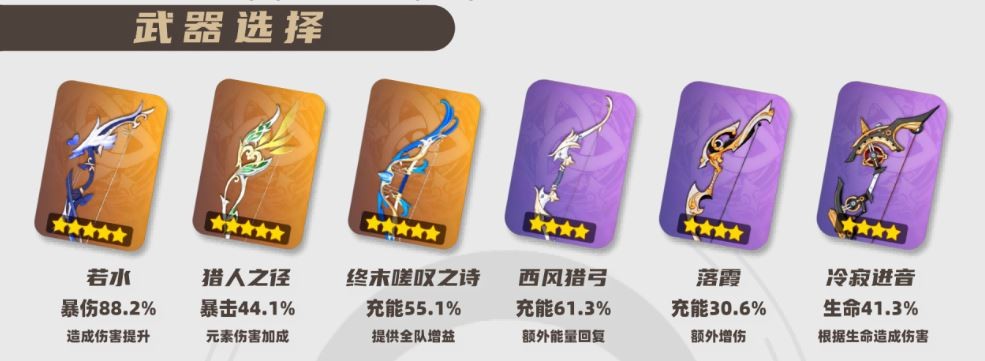 搭配反应输出角色可选择「终末嗟叹之诗」,提高自身输出则考虑「若水」、「弹弓」等,优化充能可选择「西风猎弓」、「落霞」等武器。
