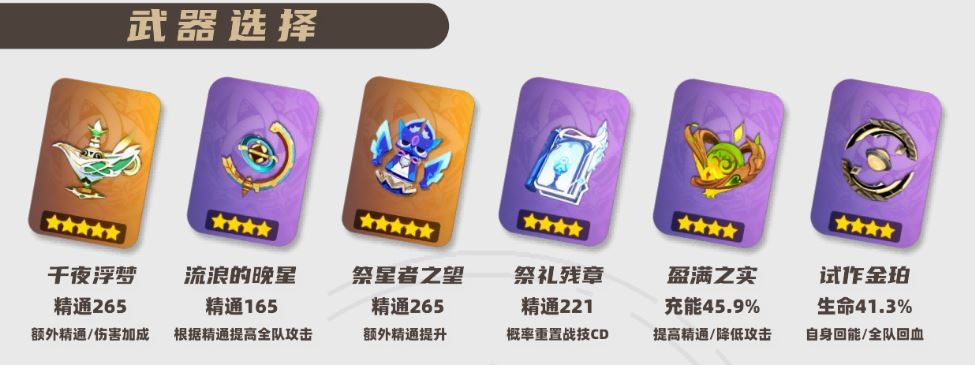 辅助向优先选择精通武器,如「千夜浮梦」、「流浪的晚星」、「祭星者之望」、「祭礼残章」等;输出向可考虑双暴类武器,如「神乐之真意」、「流浪乐章」、「匣里日月」等。