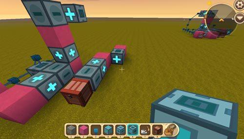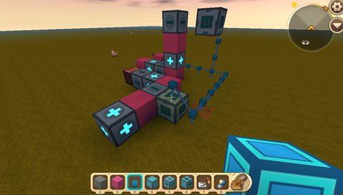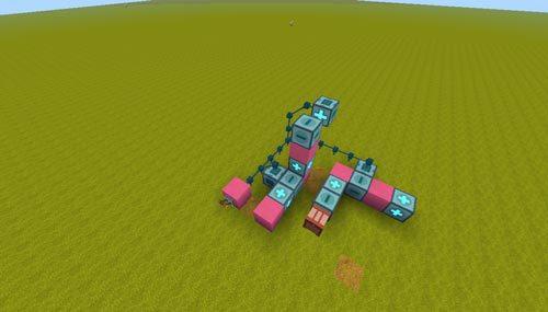 然后我们继续搭建+号方块和-号方块,当然图一滑动方块后面的辅助方块换为电能线,第二个浮空滑动方块也同样需要辅助方块来辅助调整朝向;