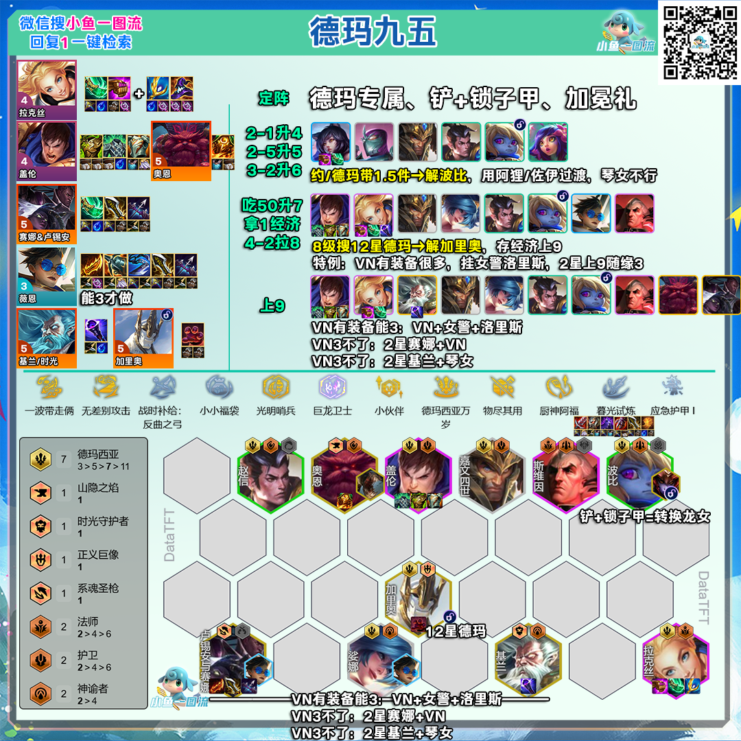 云顶之弈S16版本英雄联盟传奇主题,在新赛季会增加很多新的羁绊和棋子,还有不少老羁绊,老英雄的回归,那么有不少小伙伴好奇新赛季有什么强力阵容,下面就给大家带来s16德玛九五阵容推荐。