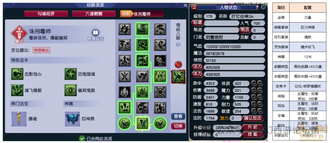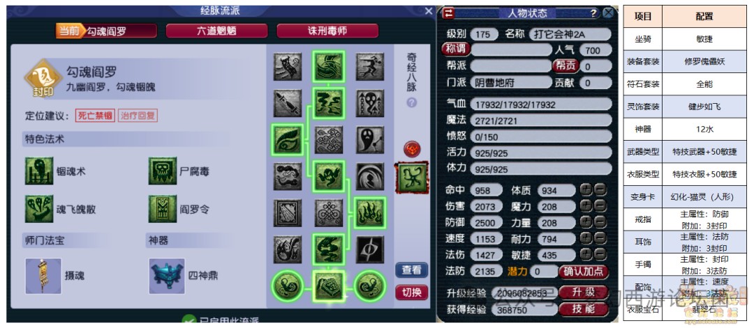 1、辅助地府装备套装:修罗傀儡妖灵饰属性:6封印,6法防实战分析:辅助地府在PK中最大的意义就在于【锢魂术】,因此需要极高的封印命中率来确保每一次【锢魂术】都能精准命中。由于地府对于速度需求较低,因此只要调整速度比队内输出更快,其他属性可以全部给体力和耐力。推荐与国标阵容、双封双辅助阵容搭配使用。
