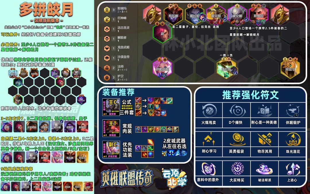 注意:这套阵容需要非常多的经济,可以作为大连败(选秀还能拿到蕾欧娜)没出路首先阵容;热补丁削弱后平均排名从4.0下降了4.1,还是强;实在D不到蕾欧娜,可以留金克丝,去解锁狼人迫降