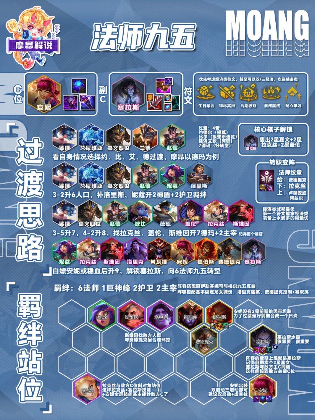 云顶之弈S16版本英雄联盟传奇主题,在新赛季会增加很多新的羁绊和棋子,还有不少老羁绊,老英雄的回归,那么有不少小伙伴好奇新赛季有什么强力阵容,下面就给大家带来s16法师九五阵容推荐。