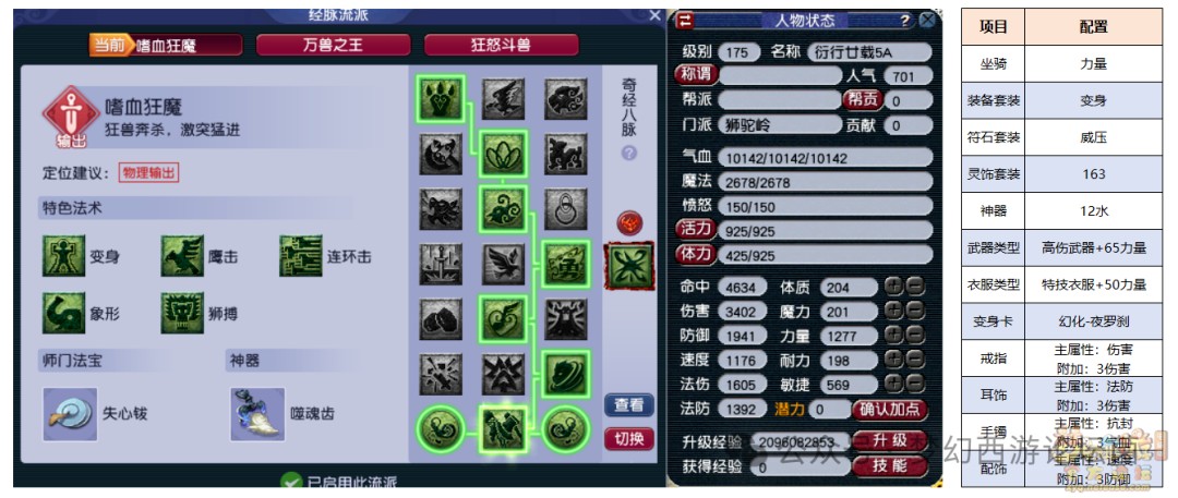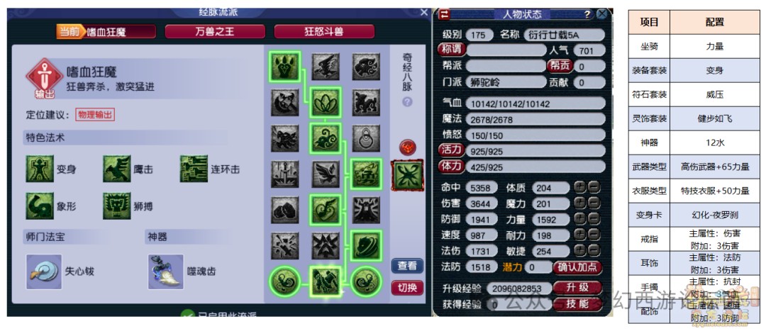 2、高速狮驼装备套装:变身灵饰属性:6伤害,6防御实战分析:以极高的速度加点来获得1100以上的速度,在PK中往往能快过大多数输出,达到先发制人的效果。这类配装方案在前期有较强压制力,但当战斗进入中后期,就会因伤害不足、抗性较低而落入下风,因此推荐三攻或四攻阵容。