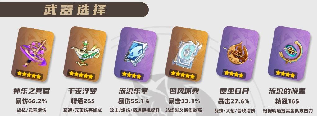 武器可优先选择「神乐之真意」、「千夜浮梦」,其次考虑「流浪乐章」、「四风原典」、「天空之卷」等泛用输出武器;站场玩法可选择「匣里日月」,持续触发武器技能。
