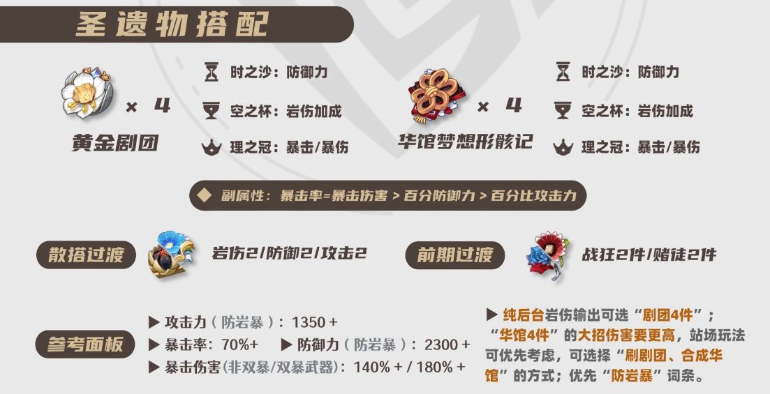 圣遗物套装可在【黄金剧团】4件、【华馆梦醒形骸记】4件中选择其一——纯后台输出优先“剧团4件”,6命站场输出优先“华馆4件”;中期可选择岩伤、剧团、华馆等2件套散搭过渡。