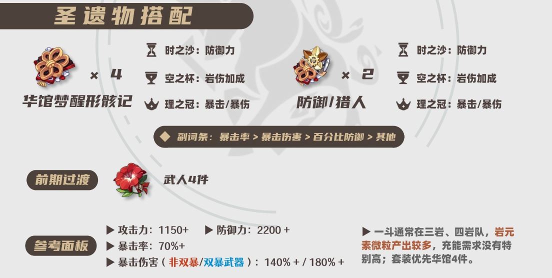圣遗物套装优先选择【华馆梦醒形骸记】4件,主词条依次为防御沙漏、岩伤杯、暴击/暴伤头冠。
