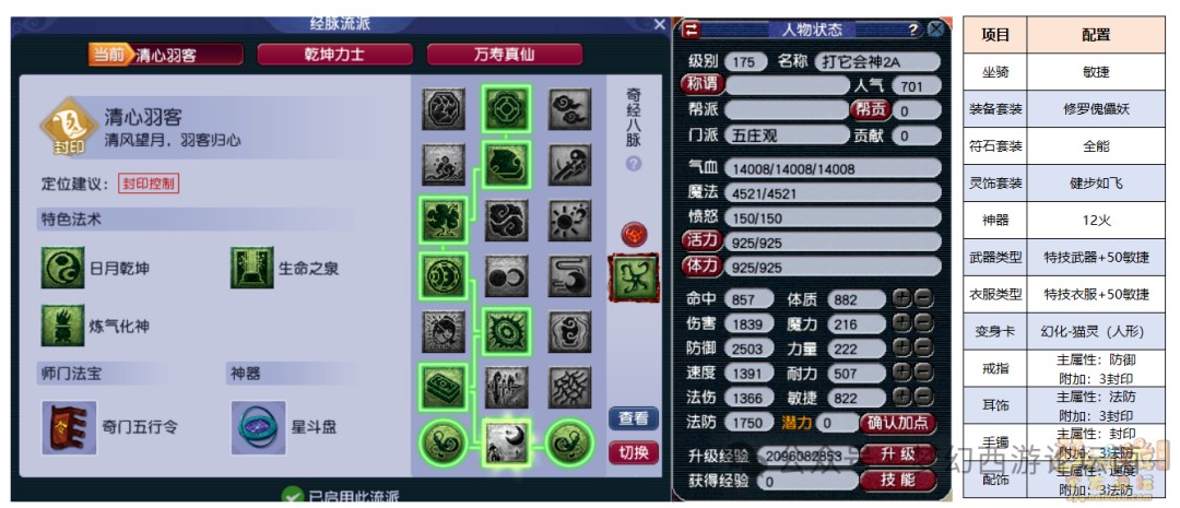 体耐五庄装备套装:修罗傀儡妖灵饰属性:6封印,6法防实战分析:因为五庄观的技能【日月乾坤】有着最霸道的效果,可以同时封印物理攻击、法术攻击、特技,在点出经脉【陌宝】后,还可以使对手无法使用道具。作为代价,【日月乾坤】的命中率极低,需要佩戴大量封印灵饰来提高封印命中率。