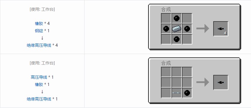 绝缘高压导线是一种损耗特大的超高压运输电缆。它能承受2048EU/t的电压,每格损耗0.8EU/t。