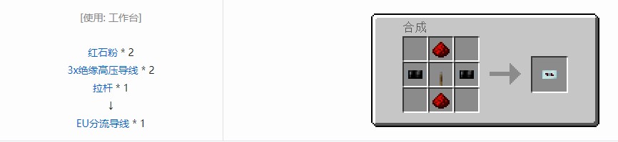 EU分流导线在通过红石信号的时候会断开与附近导线的连接,不能直接放置按钮、拉杆等。它能承受8192EU/t的电压。