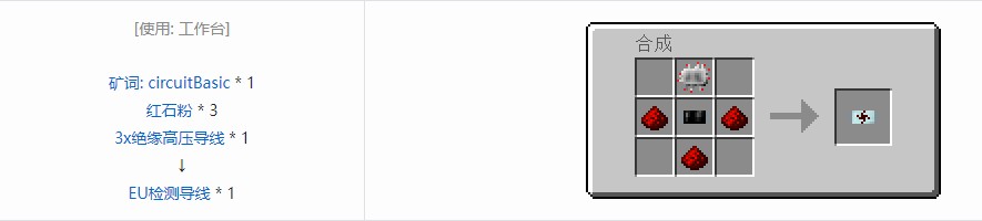 EU检测导线在通过电流的时候会发出红石信号。它能承受8192EU/t的电压。