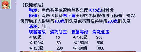3、仙玉快捷修理装备。当角色装备耐久度小于等于10点时,点击装备右下角出现的的图标按钮进行修理,每次修理增加人物装备100点耐久或者召唤兽装备200点耐久且100%成功不会失败。这里附上修理各等级装备花费仙玉的消耗,这里推荐80以内的装备直接使用仙玉快捷修理。