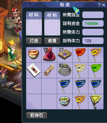 6、找帮派书院的福利总管修理装备。消耗10点帮贡、一定金钱和帮派资材。修理有一定几率会失败