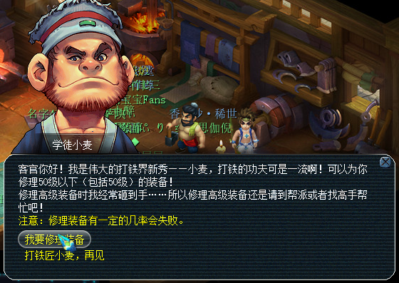 7、找长安城铁匠铺学徒小麦可以修理小于等于50级的装备。修理有一定几率会失败。