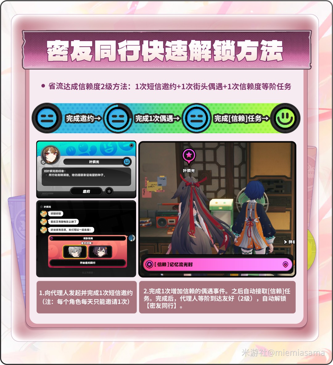 ● 省流达成信赖度2级方法:1次短信邀约+1次街头偶遇+1次信赖度等阶任务