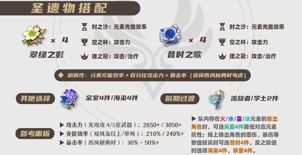 队内存在火/水/雷/冰的输出角色时,可优选「翠绿之影」4件;搭配其他元素的输出角色时,可考虑「昔时之歌」4件、「昔日宗室之仪」4件或「海染砗磲」4件。