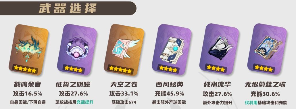 武器优先「鹤鸣余音」,其次是「证誓之明瞳」(活动获得)、「天空之卷」、「西风秘典」等;再次更多是利用武器的攻击加成、充能加成,如「纯水流华」、「无垠蔚蓝之歌」(仅利用副属性),另外辅助攻击倍率角色也可选择「讨龙英杰谭」。